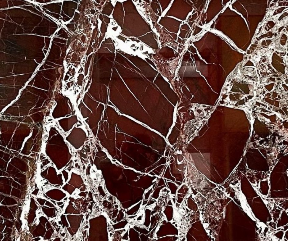 Marbre rouge bordeaux de Ligurie, traversé de veines blanches et vertes. Son toucher lisse et sa teinte chaude apportent une profondeur dramatique. Utilisé depuis des siècles, il est extrait dans des carrières traditionnelles.