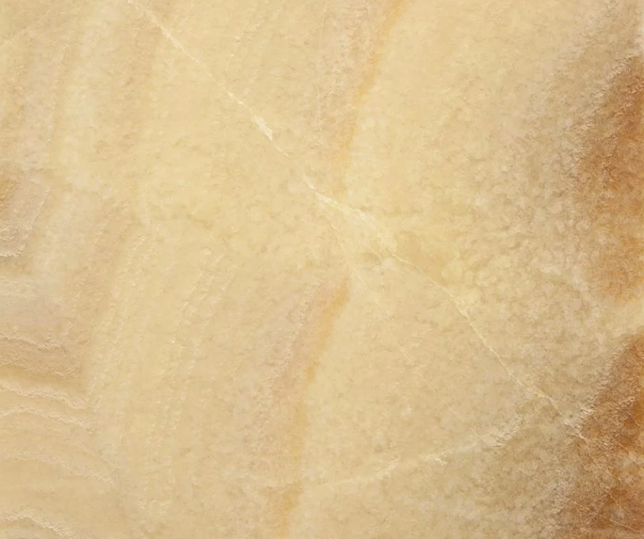 Onyx doré translucide, évoquant le miel avec des veines brunes et blanches. Son toucher lisse et sa lumière chaude créent une ambiance accueillante. Extrait dans des carrières orientales, il est idéal pour des designs raffinés.